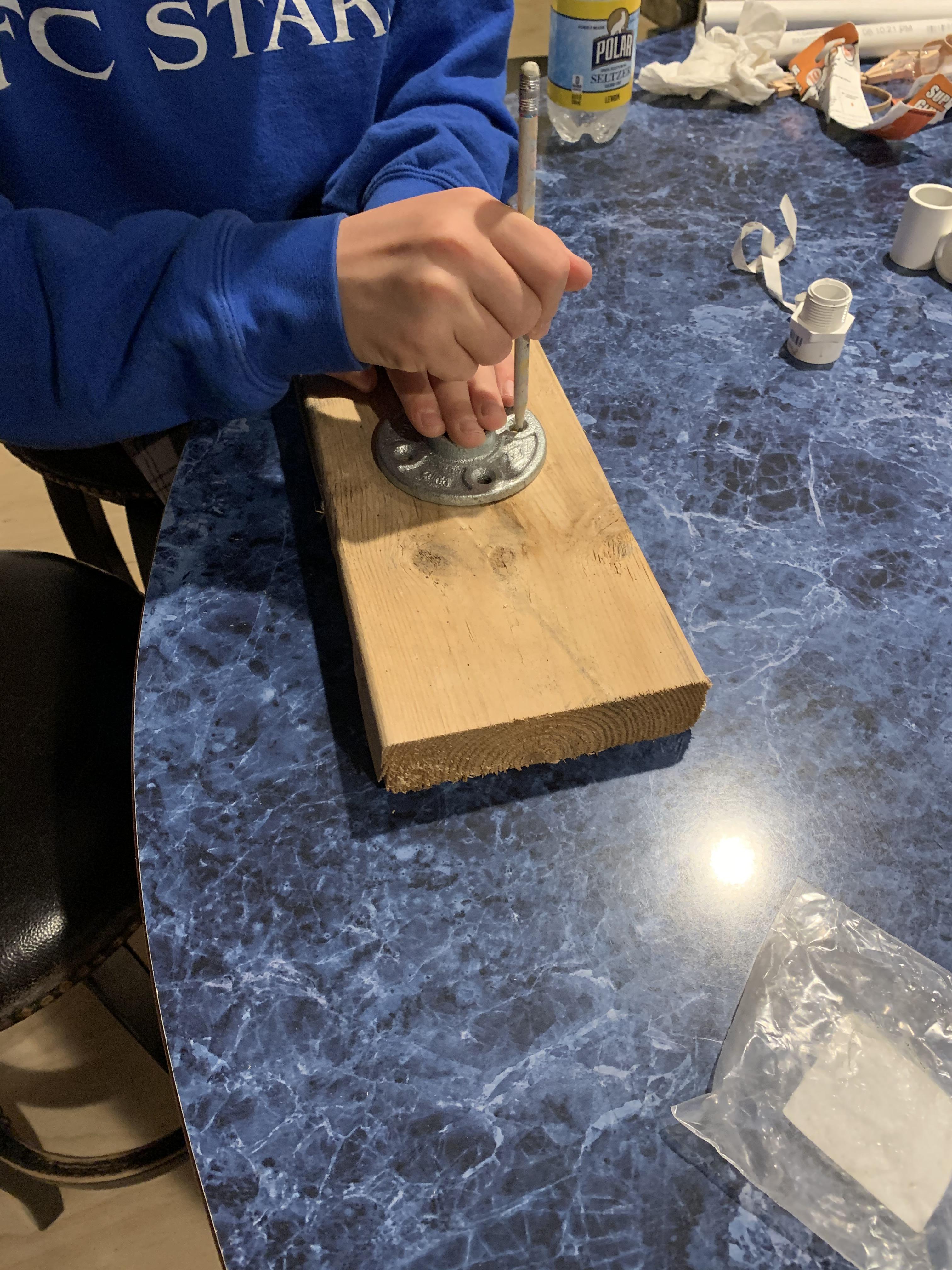 You now are going to take the metal flange and put it on top of the pine wood. Make sure that the flange is on the middle of the board. Then draw in the four holes of the flange. Next you want to drill through the holes about 1/4 of the plank deep. After this is done, put the flange back on to fit where the holes are. Now for the last step, put screws in the metal flange and drill the screws in to secure the flange in the pine wood plank.