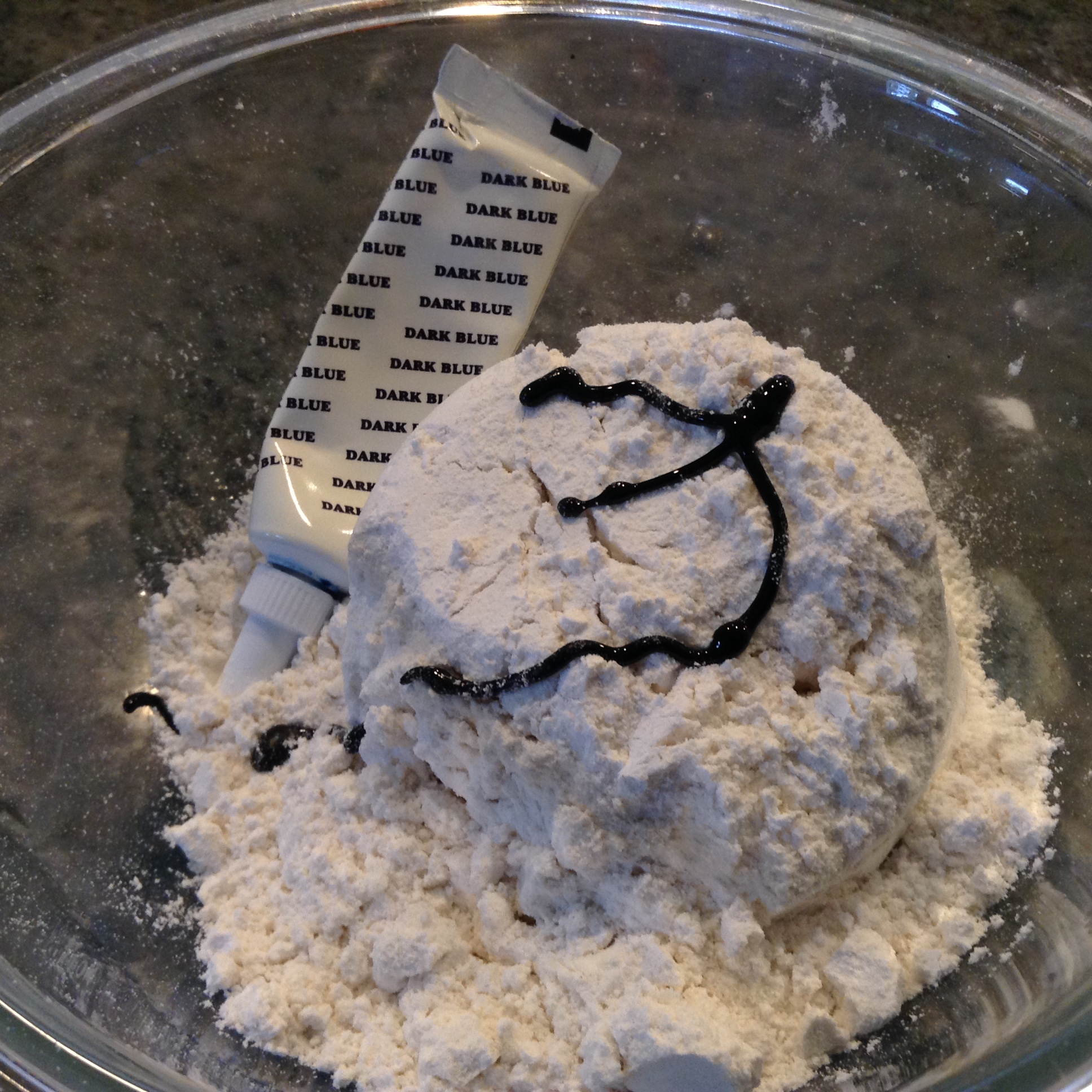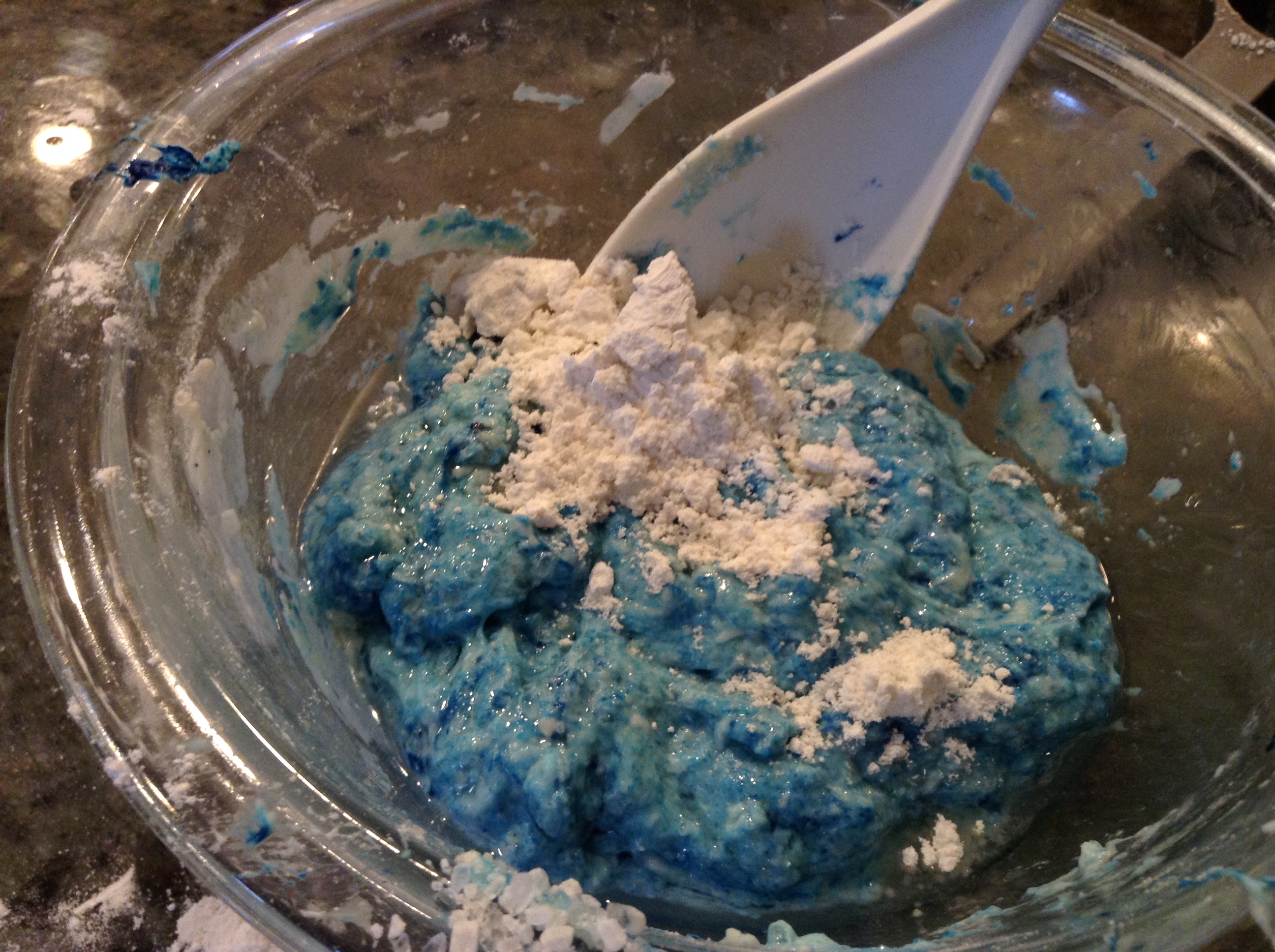 For the finishing touch add some more flour. This will depend on how sticky your dough is. For the purple with more salt I added less flour and blue I added more. It also depends on your preference of how sticky or non-sticky you like it.