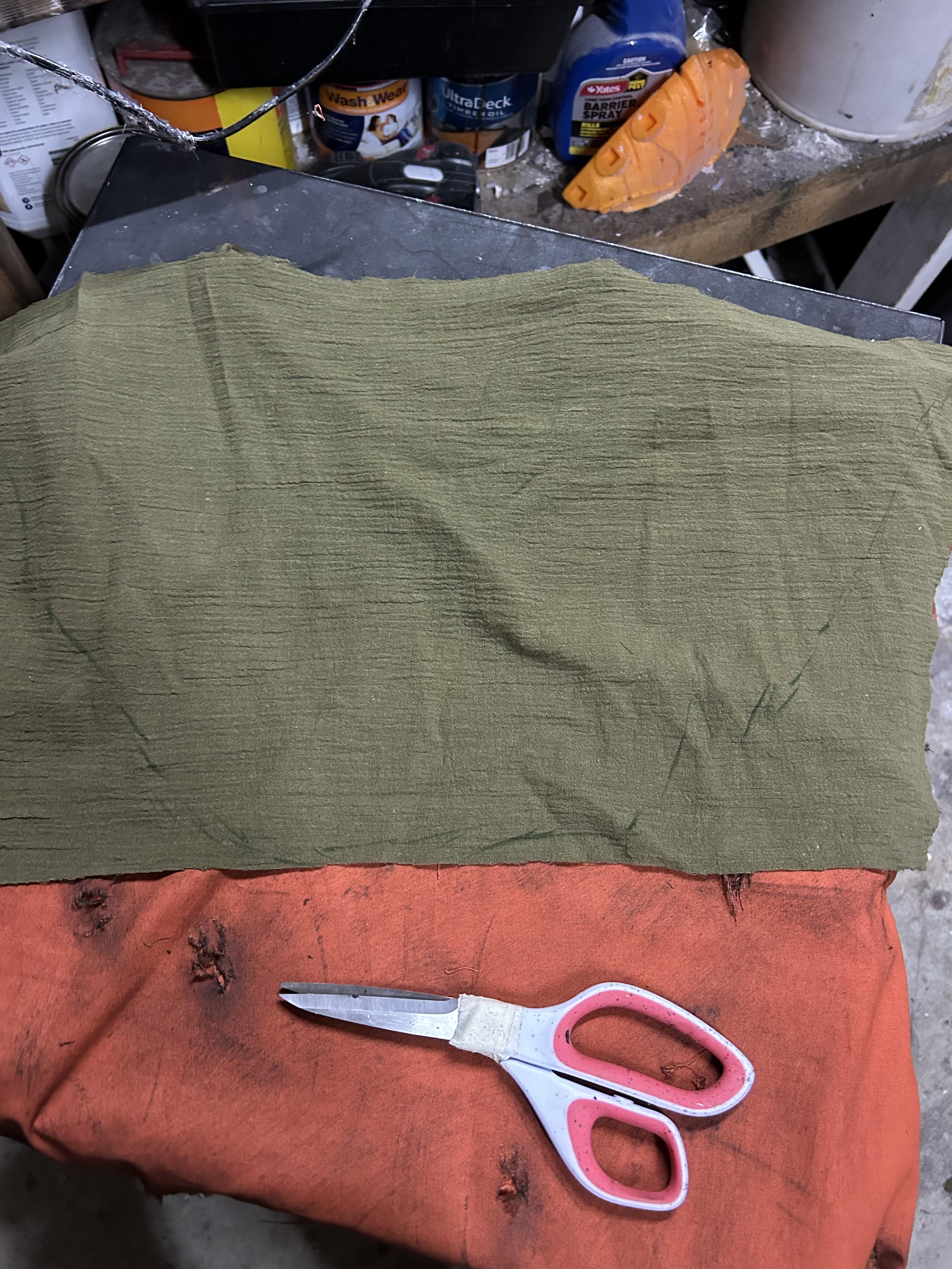 The foliage Neckpiece is one of the easiest pieces to make (Well at least one of the least complicated pieces). You start out by getting a piece of green cheesecloth, and cutting it into roughly a bandana type shape. make sure this shape covers the neck of the shirt fully. (Make sure this initial piece is also larger than you'd think you need you can always cut more off but it's way harder to subtly add more)