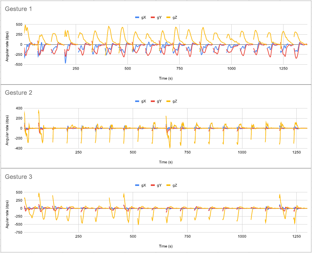 Once the device ready, it was time to record data: the goal is to record all gestures many times. I set a threshold on the gyroscope, so when gyroscope values exceed this threshold, the Arduino board starts displaying the recorded data on the monitor.