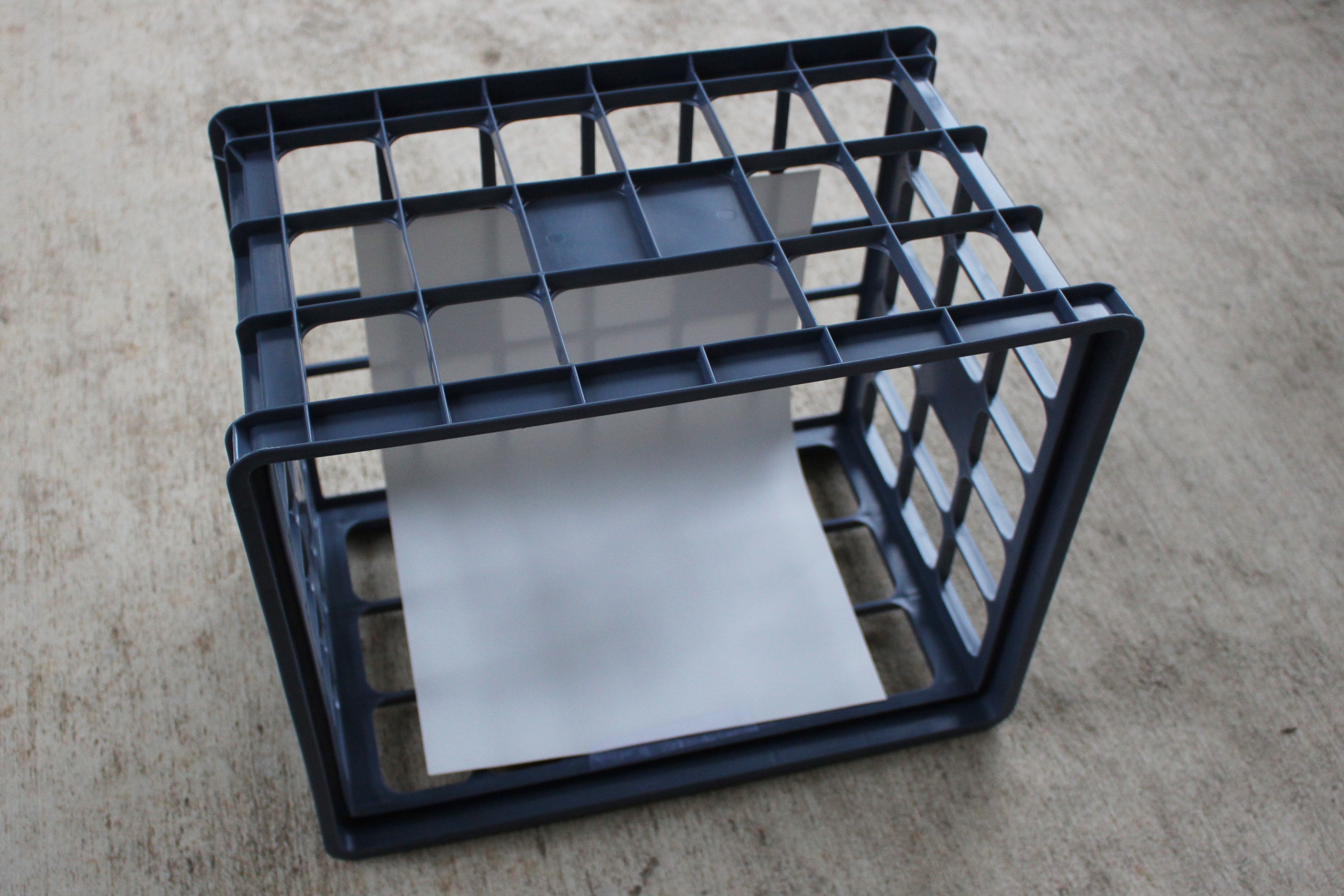 ![]() Start off by getting a large crate. Crates are great for making light boxes because they are sturdy, just the right size, and have holes which flashlights (and other lamps) can fit in. | ![]() Tilt the crate on its side. Attach a poster board to the inside of the crate using tape. Lightly bend the poster board at the seam so no crease is visible. This will be the backdrop for your photos. | |