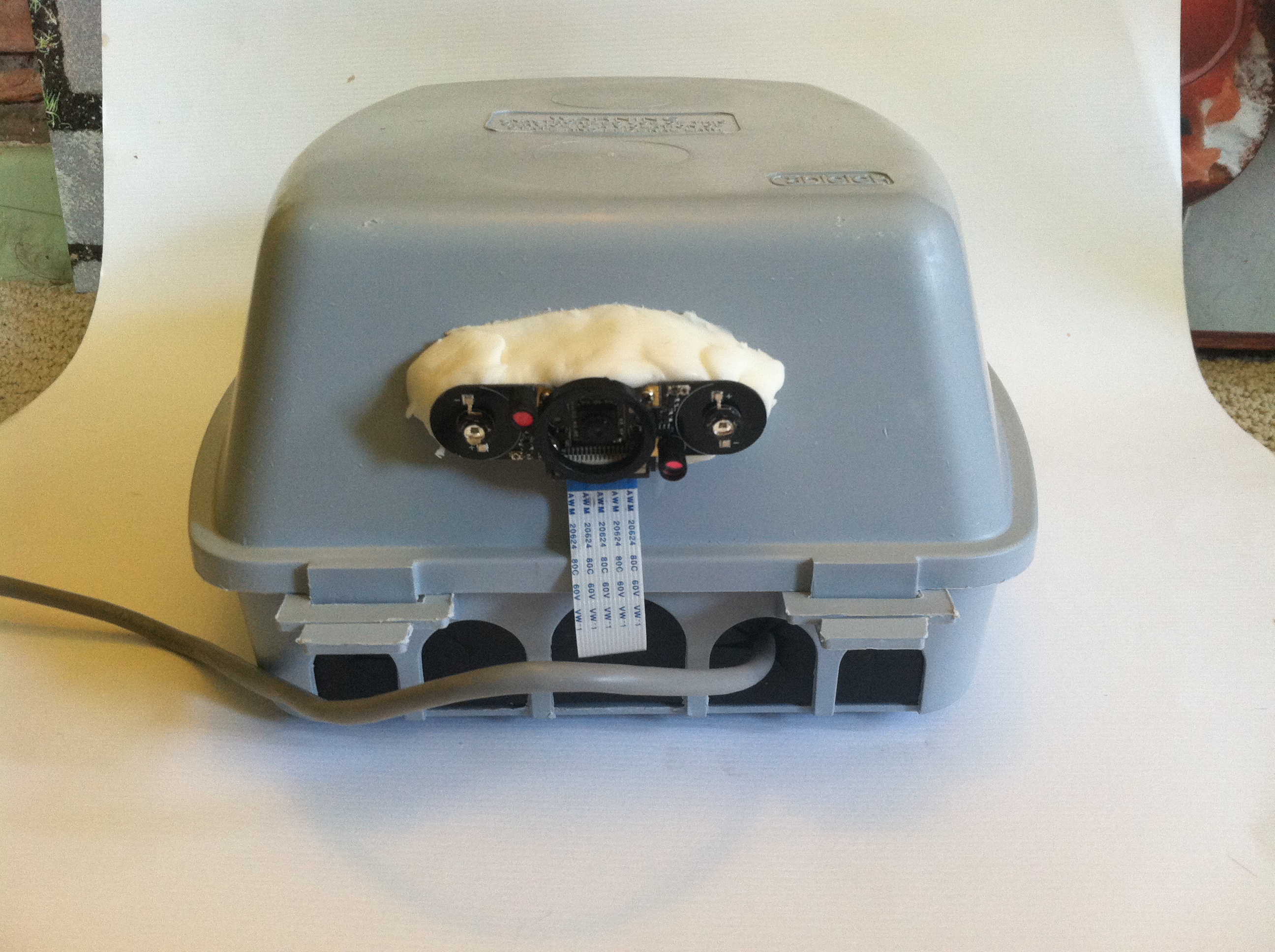 The camera is attached using "Oogoo" (or silicone caulk as you normally would call it, mixed with corn starch). The caulk hack is my go-to solution for improvised waterproofing. Still to do - build a shell around the camera to keep water out. That won't be hard. You'll note that the camera points inwards a little. You want to cover the entrance to the hive and catch bees that enter from above as well as from the landing zone in front of the entrance.